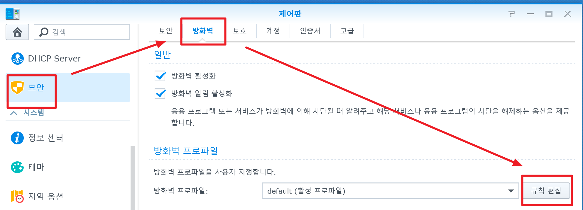 1) 먼저 Synology 제어판 안에 있는 보안 -> 방화벽에 들어가서 "규칙 편집"을 클릭한다.