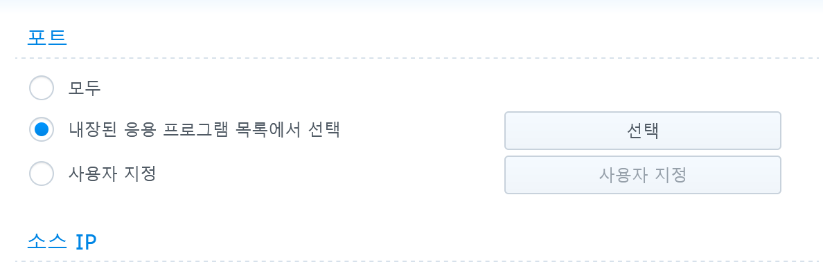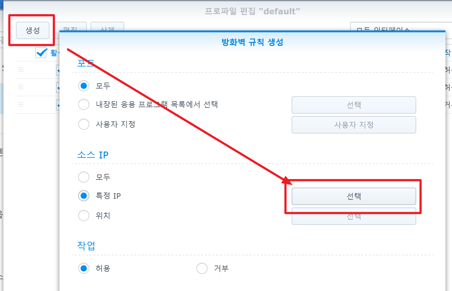 2) 이제 "생성" 버튼을 누른 뒤, 소스 IP의 특정 IP 부분에 있는 "선택" 버튼을 클릭한다.
