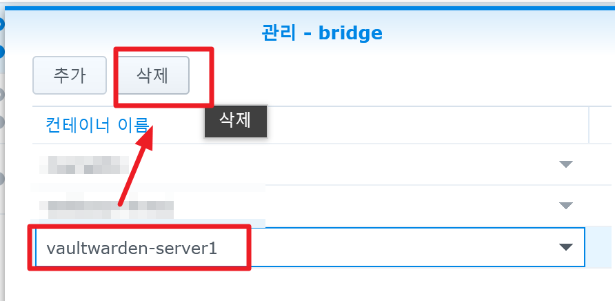 5) 팝업이 떴으면 그 안에서 Vaultwarden 컨테이너 이름을 클릭한 뒤, "삭제"를 클릭한다. 그리고 "적용"을 눌러 나온다.