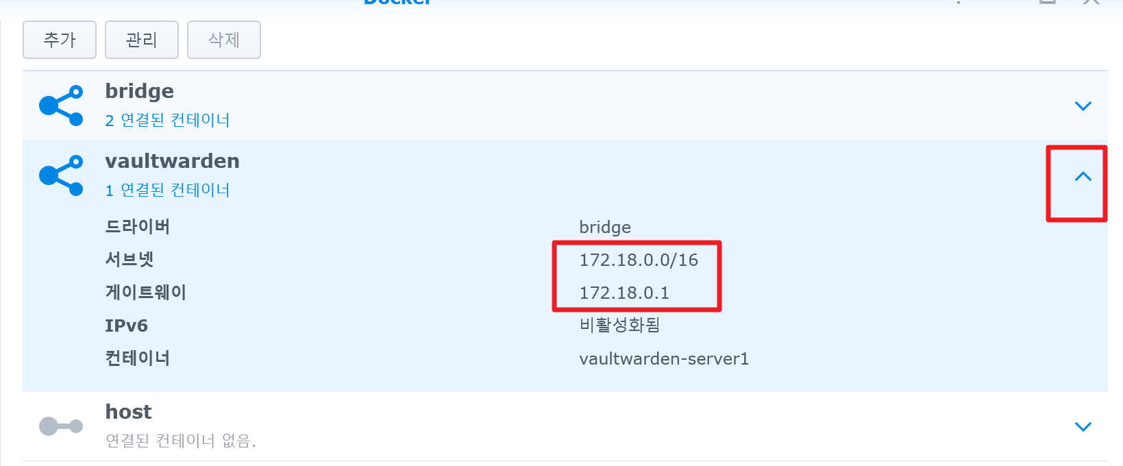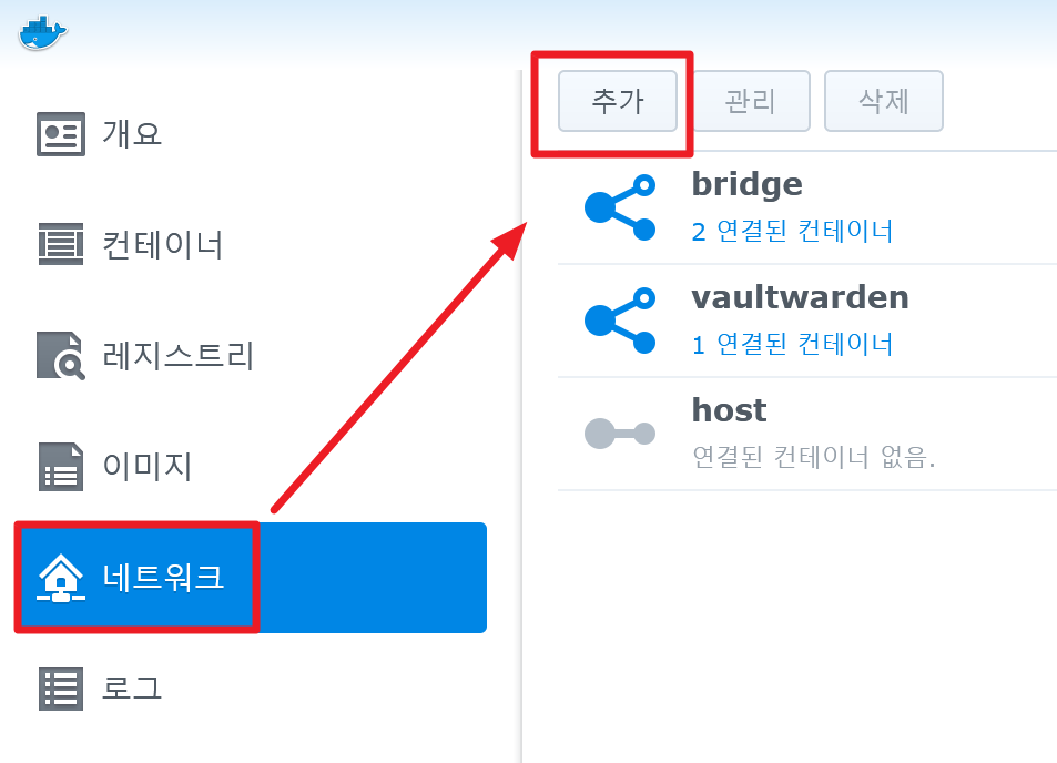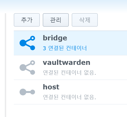 4) 기존에 만들어진 Vaultwarden 컨테이너가 연결된 네트워크 부분을 클릭하고 상단의 "관리" 버튼을 클릭한다.