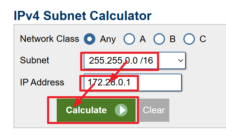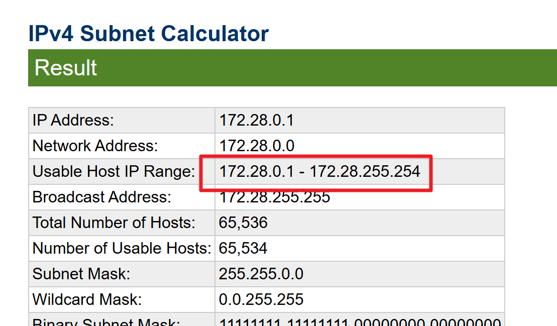 9) 확인된 정보를 IP 범위를 알아낸다. 물론 네트워크 지식이 많으면 단번에 172.18.0.1 ~ 172.18.255.254 라는 것을 알 수 있지만, 대개는 알기 어렵다. IP Subnet Calculator 사이트에 들어가 아래와 같이 정보를 넣고 계산을 하면 IP 범위를 알 수 있다.