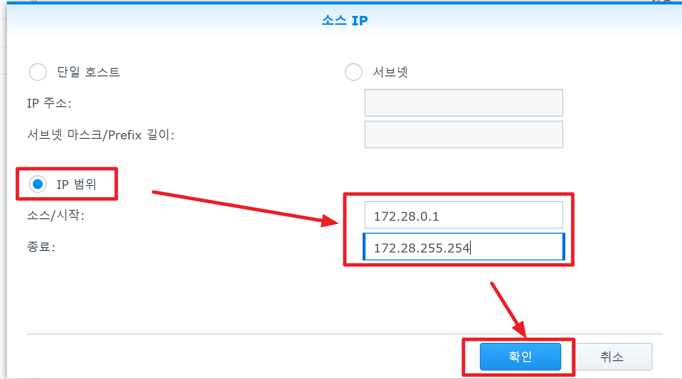 3) 소스 IP 설정 창에서 "IP 범위"을 선택하고, 위에서 찾아낸 IP 범위의 시작과 끝을 입력한다. 그리고 확인을 클릭해서 닫는다.