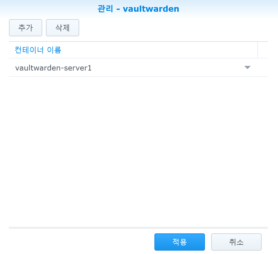 7) 팝업 화면에서 이번에는 "추가"를 누른 뒤, Vaultwarden 컨테이너를 선택하고 "적용"을 클릭해서 닫는다.