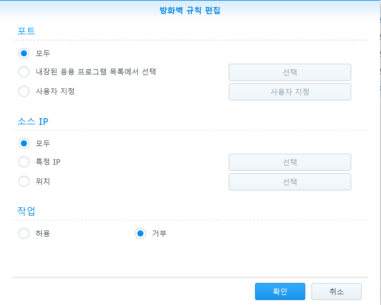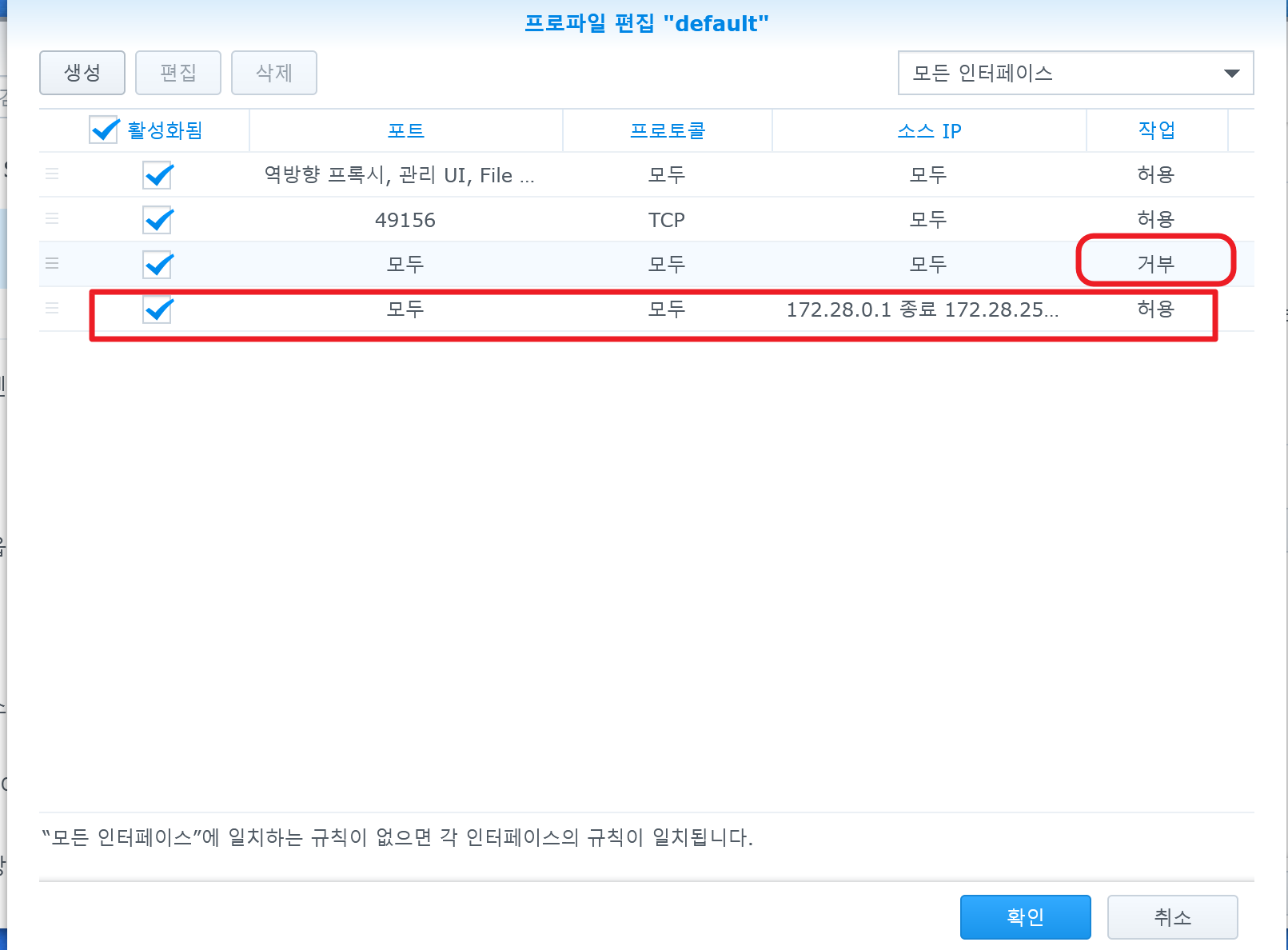 "거부" 항목을 맨 아래로 옮기면 된다. 항목의 맨 왼편을 보면 마우스로 잡고 아래로 끌어내릴 수 있는데, 바로 거부 규칙을 맨 아래로 끄집어 내리면 된다. 그리고 "확인" 버튼을 눌러 닫으면 방화벽이 적용된다.