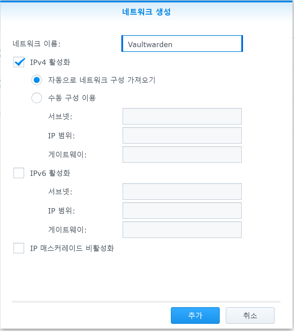 3) 이름을 정해주고 "추가" 버튼을 눌러 새로 생성한다. 물론 수동 구성을 통해 적당한 네트워크를 만들 수도 있지만, 그냥 편하게 만들어 봤다.