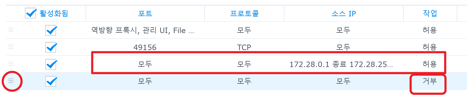 3. 방화벽 규칙 순서는 아래에서 위로 진행되며, 아래에 있는 내용보다 위에 있는 내용을 우선한다.